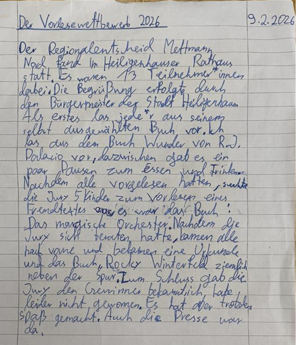 Alina Zahn (6a) hat als Schulsiegerin das SGW beim regionalen Vorlesewettbewerb in Heiligenhaus vertreten und dort einen Auszug aus dem Roman "Wunder" (Raquel J. Palacio) mit starker Leistung vorgetragen. Ihre Erlebnisse an diesen aufregenden Tag hat sie im Rahmen eines Berichts und einiger Fotos für uns festgehalten: