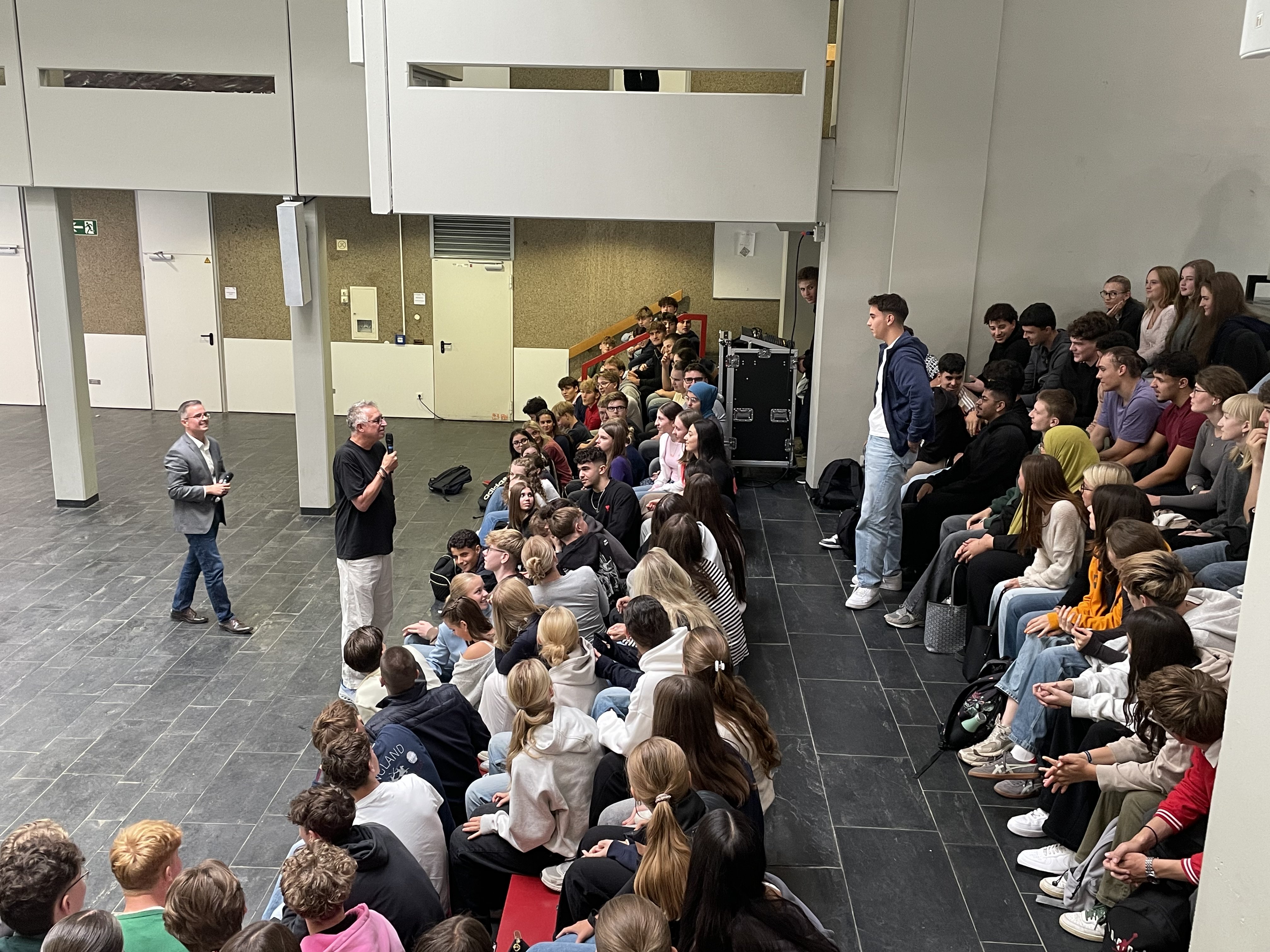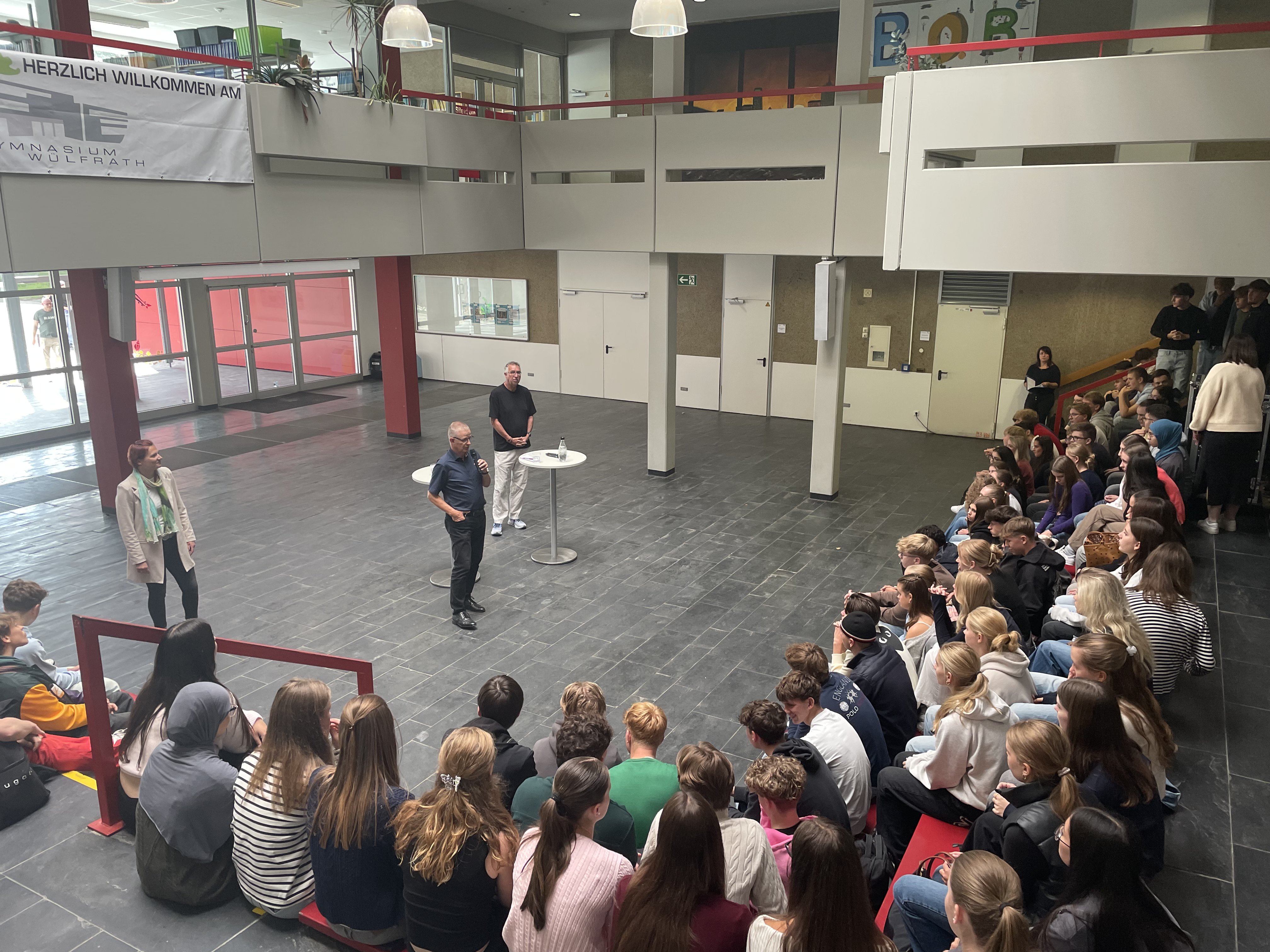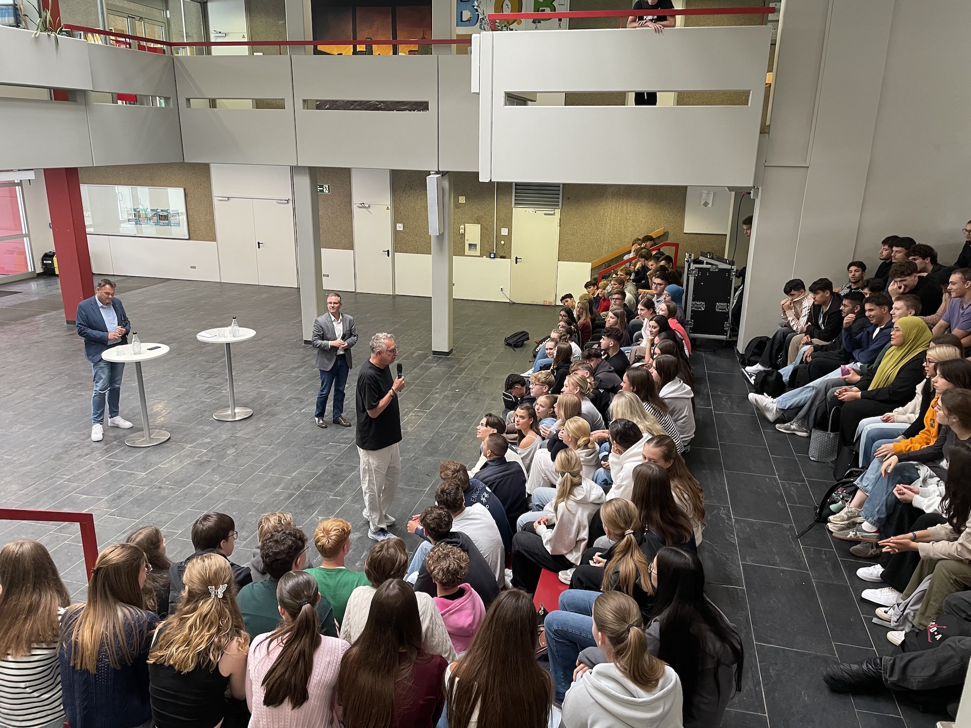 Im Forum unseres Gymnasiums wurde es politisch spannend: Die beiden Bürgermeisterkandidaten Sebastian Schorn (CDU) und Christian Wolf (SPD) folgten der Einladung zur Podiumsdiskussion und stellten sich den Fragen der Schülerschaft. Nach kurzen Einblicken in ihre Programme ging es schnell zur Sache – die Jugendlichen hatten viele, teils sehr kritische Nachfragen vorbereitet, die von den Gästen engagiert beantwortet wurden.