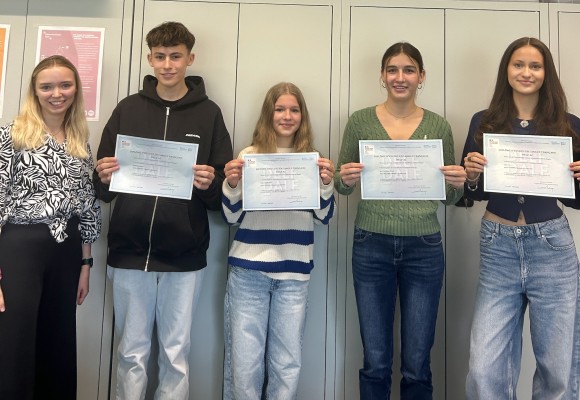 Die vier SchülerInnen der Jahrgangsstufe 10, Laura A., Flora F., Roya K. und Maximilian S., haben die im letzten Schulhalbjahr abgelegte DELF A2-Prüfung mit tollen Ergebnissen bestanden. Nach der gemeinsamen Vorbereitung im Rahmen der DELF-AG durch unsere Französisch-Referendarin Frau Schneider sind nun endlich die offiziellen Zertifikate eingetroffen. Wir sind sehr stolz auf euer Engagement im Fach Französisch!