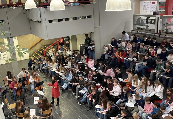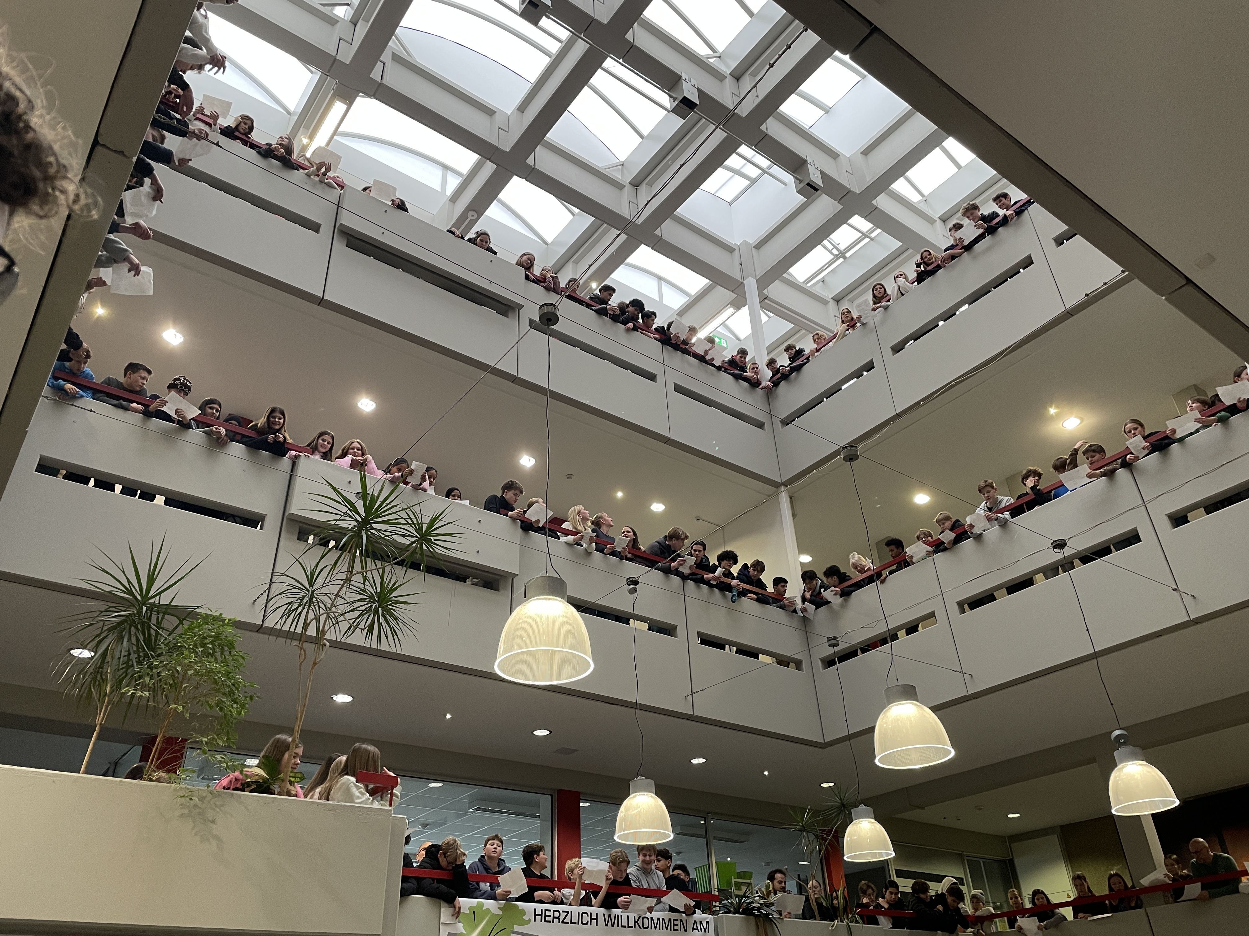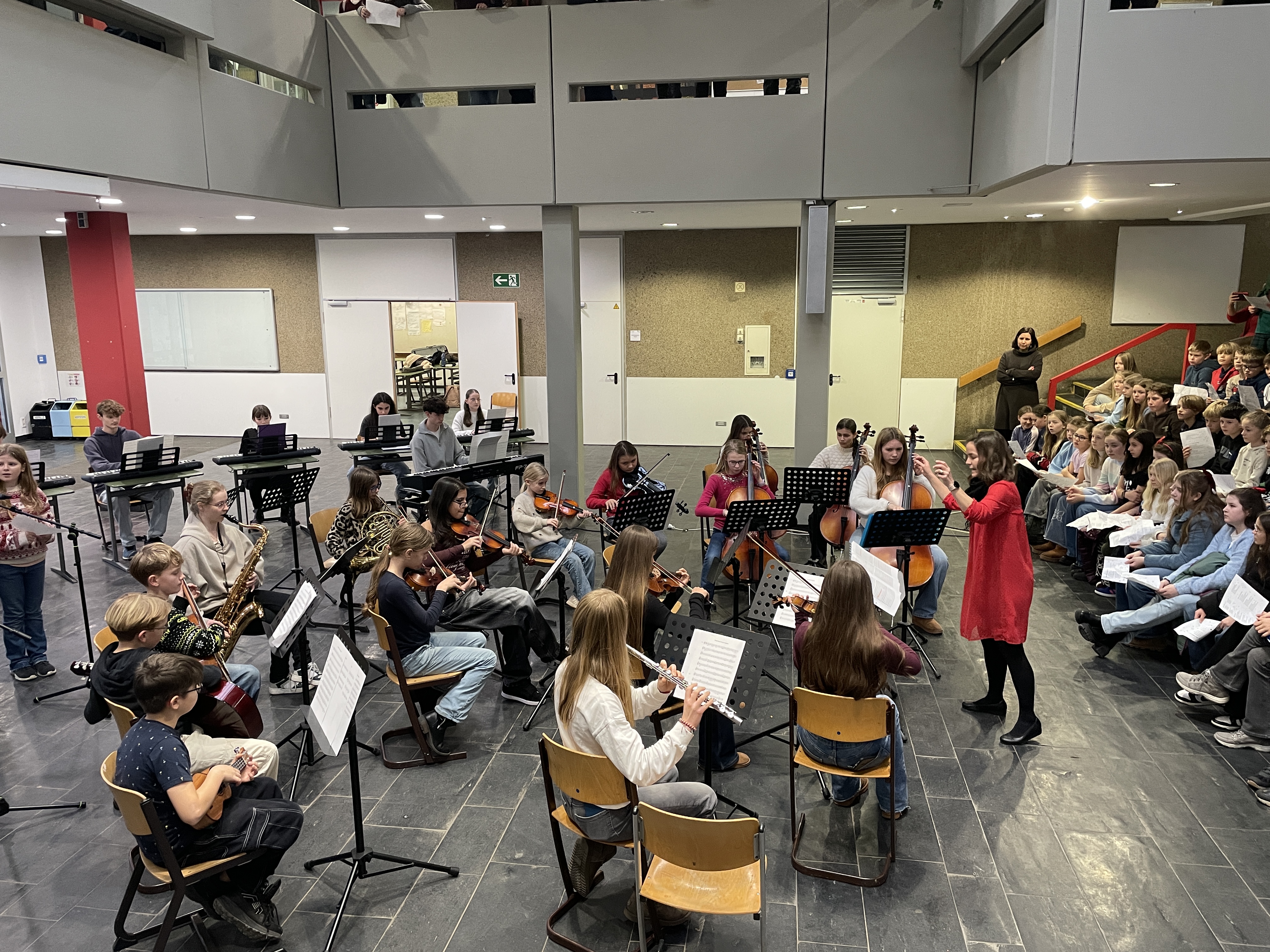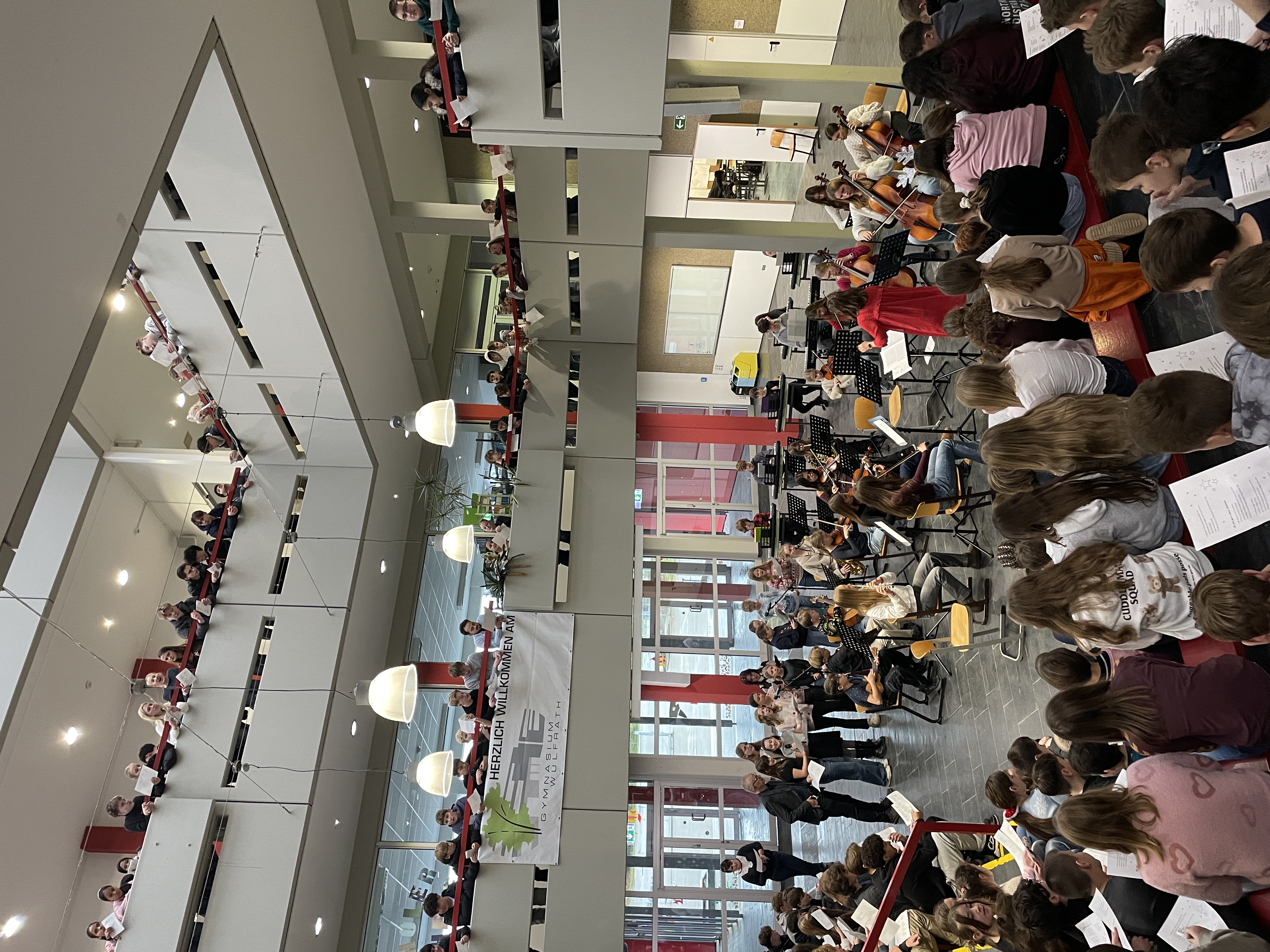 Fast die gesamte Schulgemeinde versammelte sich heute in der letzten Unterrichtsstunde zum gemeinsamen Singen von Weihnachtsliedern. In festlicher Stimmung erfüllten bekannte Melodien das Forum – und zum krönenden Abschluss erklang ganz laut „We Wish You a Merry Christmas“. Musikalisch begleitet wurden wir dabei vom Schulchor und dem Schulorchester, die für einen besonders stimmungsvollen Rahmen sorgten.