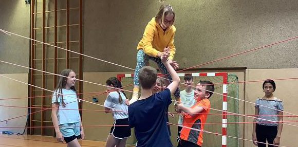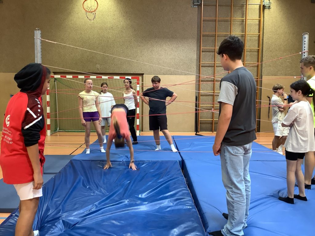 An insgesamt elf Stationen versuchten sich die Schülerinnen und Schüler. Hier eine Auswahl: An der Schule am Berg gab es eine Station mit Schwungtuch, eine Wassertransport-Staffel mit Bechern über unser Klettergerüst und eine Station, an der Wasser durch eine lange Plastikfolie geleitet werden soll. Am Gymnasium war das „Spinnennetz“ aufgebaut und es musste das „Inselspiel“ und der „Mondball“ bewältigt werden. Und im KJH gab es den „Tower of Power“ und „Wo ist Henriette“. Zum ersten Mal war auch eine Station der Caritas in der Bergstraße 2 dabei, angeleitet von der Streetworkerin Zoe Kempkens.