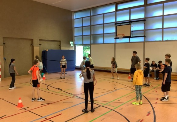 Die Schülerinnen und Schüler der 10c betreuten entweder Gruppen auf ihrem Weg zu den einzelnen Veranstaltungsstätten oder leiteten in der Halle des Gymnasiums die Spiele an. Sie konnten auf diese Weise gleich ihre ersten pädagogischen Erfahrungen sammeln. Ein Dank verdienen aber auch die Sanitäterinnen, die das Projekt begleitet haben.