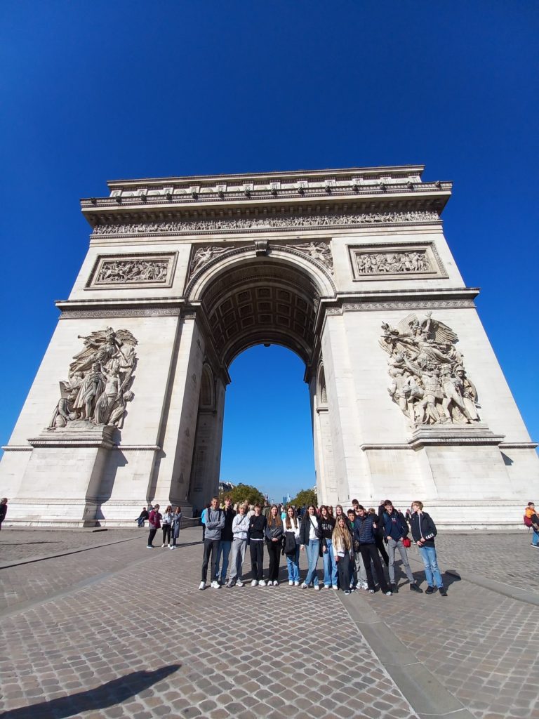 Unser dritter Tag des Schüleraustauschs begann mit dem Auschecken aus unserem Hotel in Paris. Glücklicherweise konnten wir unsere Koffer noch dort lassen, um den Tag für weiteres Sightseeing in der Stadt zu nutzen. Zuerst führte uns unser Weg mit der Métro zum berühmten Arc de Triomphe. Bei strahlendem Sonnenschein haben wir das beeindruckende Grab des unbekannten Soldaten besucht und den einzigartigen Blick auf die sternförmig angelegten Straßen rund um den Triumphbogen genossen. Besonders faszinierend war der Anblick des lebhaften Verkehrs, der sich um den Bogen herumschlängelte – ein echtes Pariser Erlebnis!